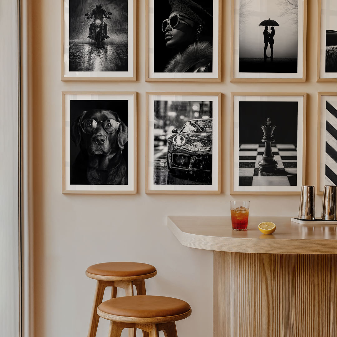 Ce mur d'art captivant est composé d'affiches en noir et blanc soigneusement sélectionnées qui créent une profonde sensation de calme et de contemplation. Chaque affiche se complète par un contraste subtil et un style intemporel, évoquant une atmosphère urbaine et chic. En illuminant la pièce de sa présence sophistiquée, ce mur d'art devient un point focal élégant dans la cuisine.
