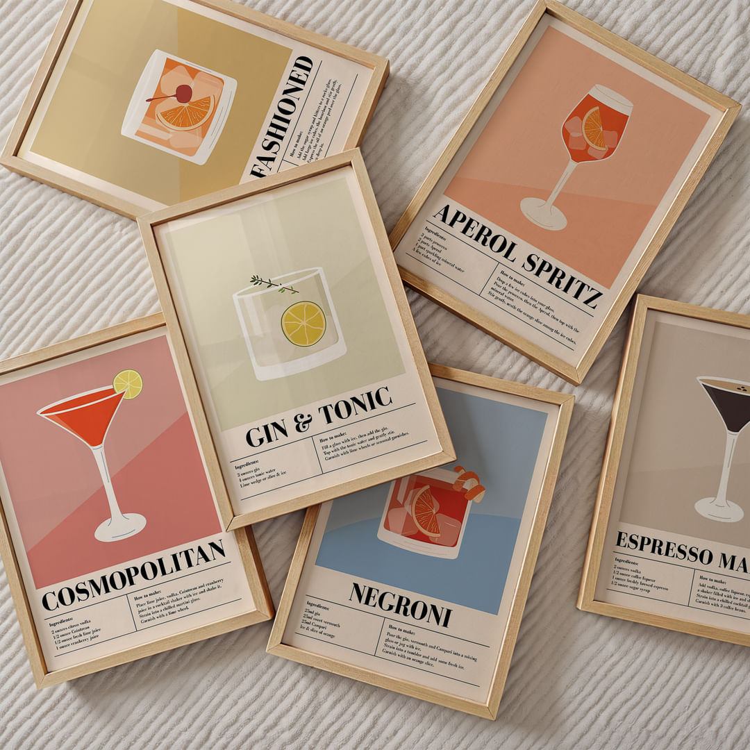 Le mur d'art attire immédiatement le regard avec ses motifs colorés et stylisés inspirés des cocktails. Chaque tableau apporte sa propre couleur et son charme, créant une atmosphère vivante et élégante.