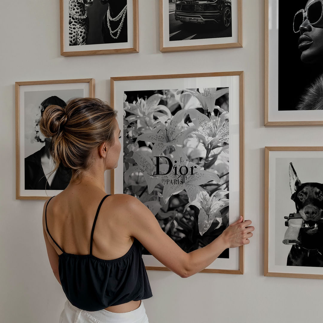 Une collection d'affiches noir et blanc crée un mur d'images à la fois élégant et moderne. Le mélange de motifs soigneusement choisi offre un équilibre harmonieux entre élégance classique et sophistication contemporaine. Une Lamborghini, des animaux ludiques, des fleurs Dior et des portraits délicats créent une atmosphère qui sublime n'importe quelle pièce d'une beauté intemporelle et chic. Parfait pour les amateurs de style.