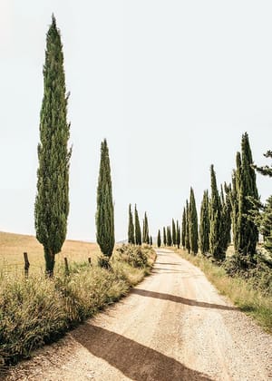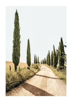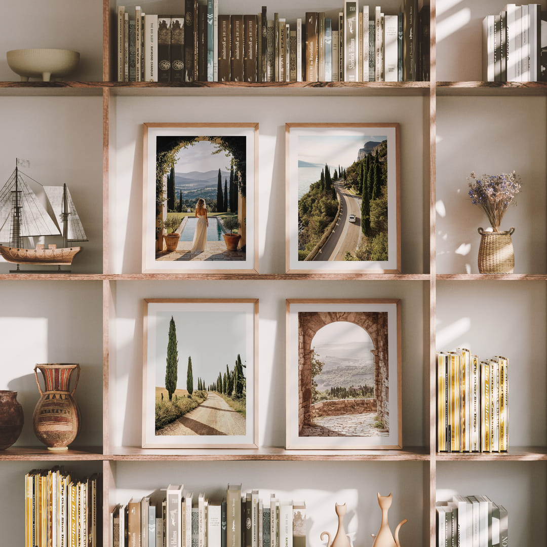 Cette œuvre d'art murale allie une harmonie onirique à des tons chauds et naturels. Les tableaux offrent un aperçu de la beauté méditerranéenne, avec ses routes sinueuses, ses cyprès majestueux et ses arches anciennes, créant un voyage visuel à travers le temps et l'espace. L'éclairage tamisé et les motifs soigneusement sélectionnés animent la pièce, où chaque tableau contribue à une atmosphère sophistiquée et enchanteresse.