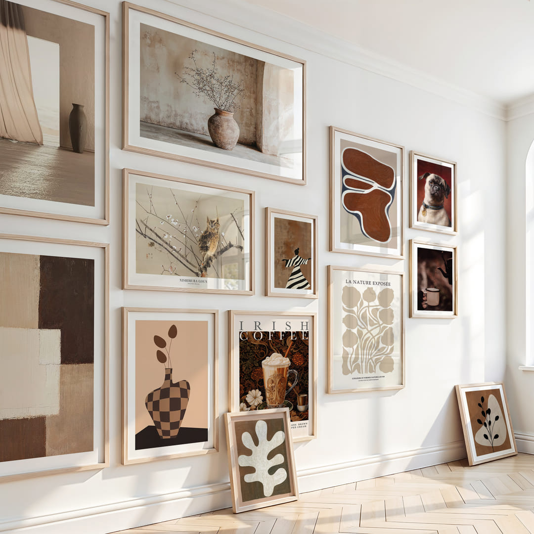 Ce mur d'art est une collection élégante où les tons naturels et les motifs subtils créent une atmosphère calme et harmonieuse. Les tableaux marient des éléments naturels, tels que des animaux et des plantes, à un art stylisé et à des formes graphiques, pour un résultat raffiné. Idéal pour sublimer un salon d'une sérénité moderne et d'une beauté intemporelle.