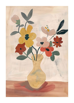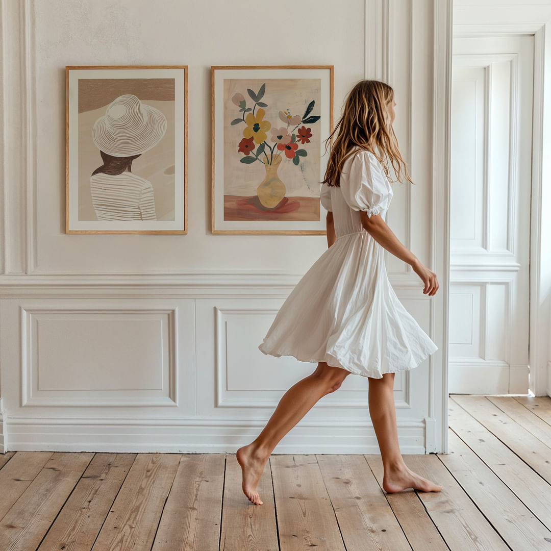 Ces affiches ouvrent la pièce avec leurs tons doux et leurs motifs apaisants, où le contraste entre une silhouette solitaire et un bouquet de fleurs crée une dynamique subtile. Le choix de couleurs claires et neutres contribue à une atmosphère de tranquillité et d'élégance. Cette combinaison sublime un salon par sa beauté discrète et l'impression d'une œuvre d'art soigneusement sélectionnée.