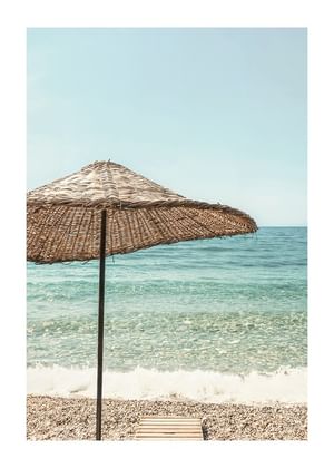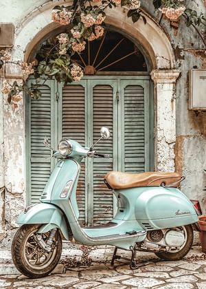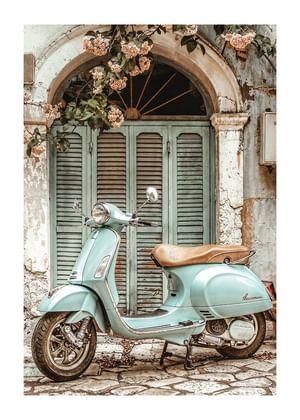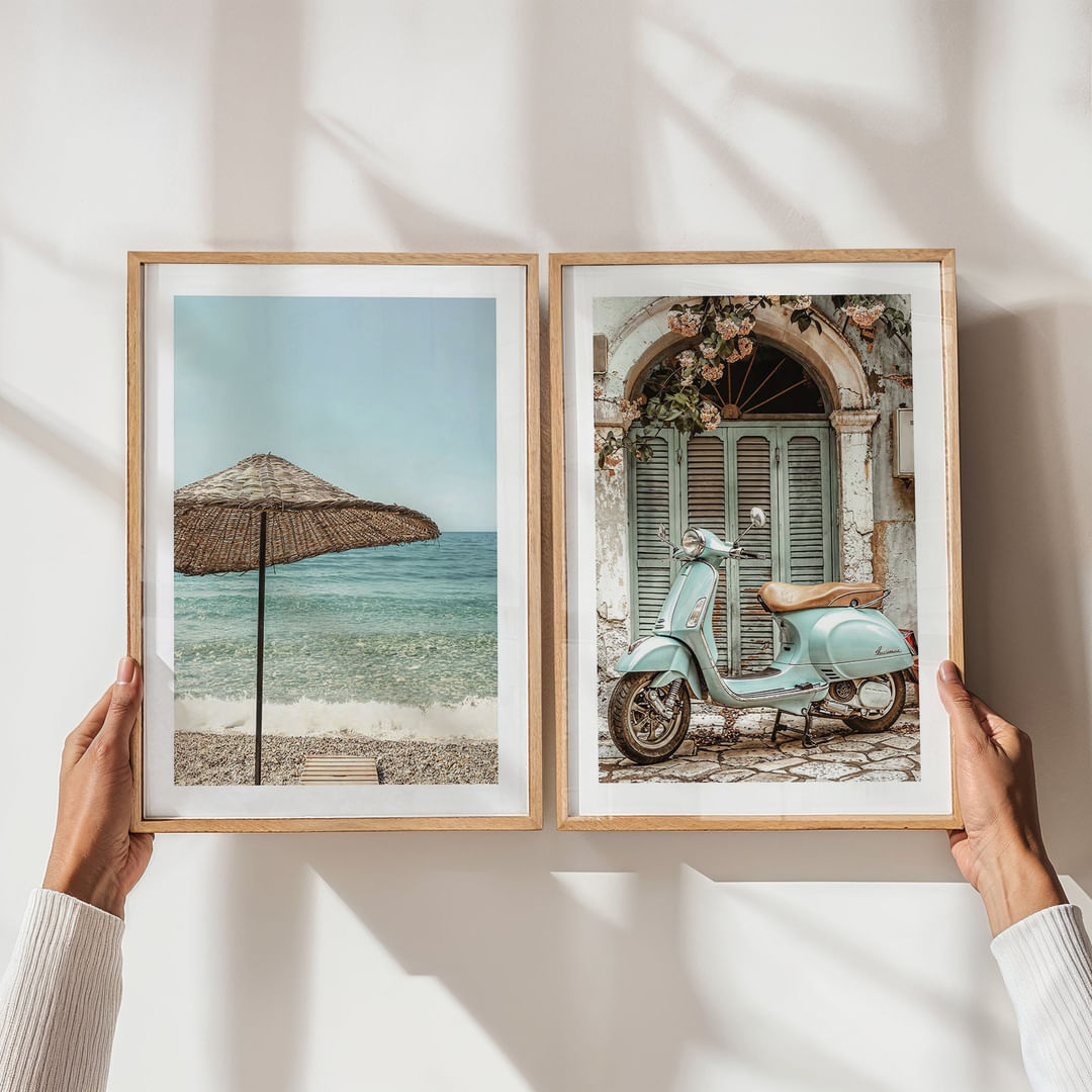 Ces deux affiches illustrent le rêve de vacances parfaites, avec une plage tranquille et un charmant scooter rétro devant une maison pittoresque. L'une représente une plage avec un parasol, l'autre un scooter vert menthe. Ces deux affiches dégagent une atmosphère à la fois nostalgique et moderne, sublimant l'atmosphère de la pièce où elles sont accrochées. Un ajout parfait pour insuffler l'envie de voyager et un esprit d'aventure à la maison.