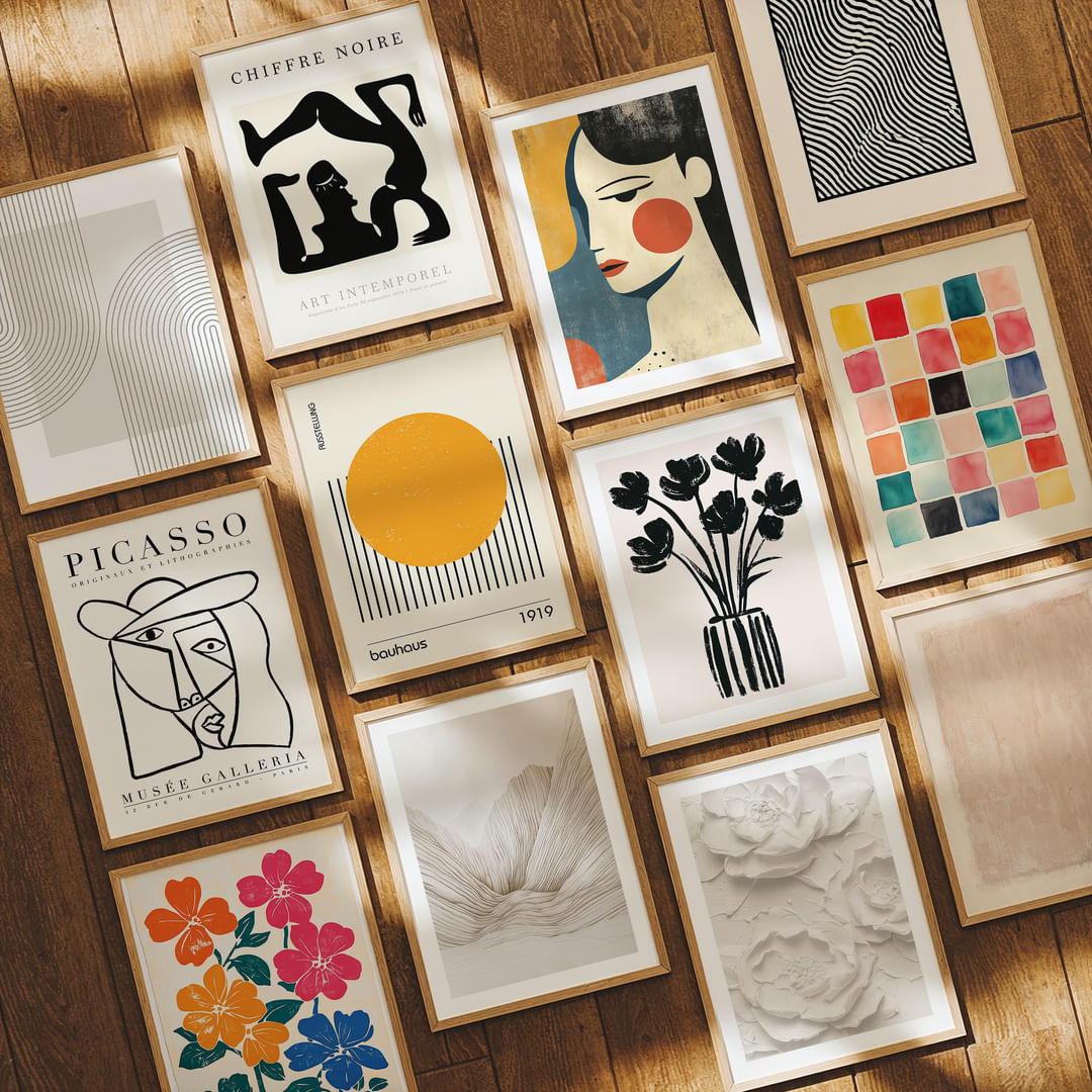 Ce mur d'art présente une magnifique symphonie de couleurs contrastées et de formes dynamiques. Chaque tableau apporte son propre style, des motifs géométriques ludiques aux élégants motifs floraux. L'ensemble crée une impression d'art sophistiqué et transforme la pièce en une galerie vivante qui attire et inspire le regard.
